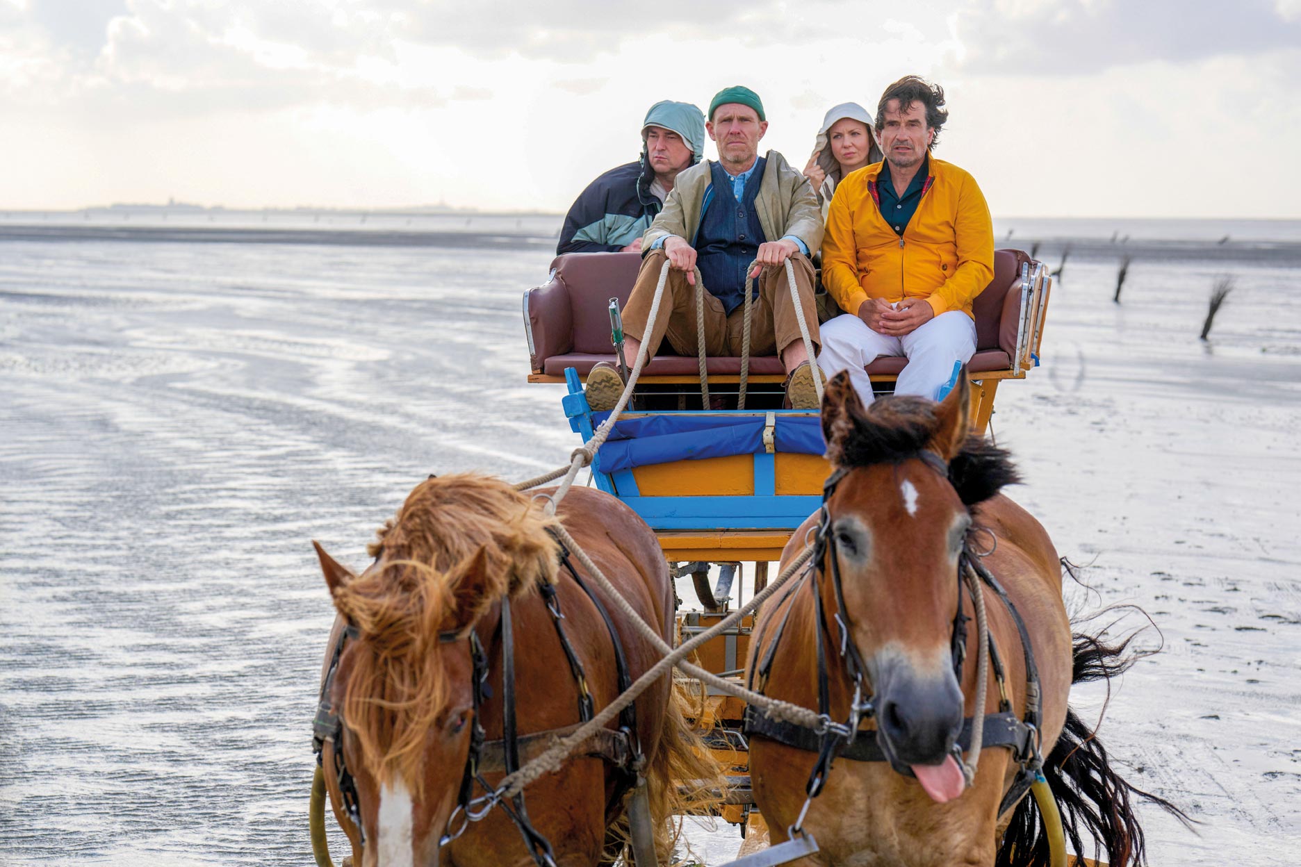 „Mein optimaler Start in den Tag hier vor Ort ist ein Spaziergang zum Watt“, beschreibt Oliver Mommsen eine seiner Routinen. „Morgens um 6 Uhr mit noch müden Augen Richtung Watt gehen und über die Wiese zurück. Dann kann der Tag kommen. Beim Spazierengehen kann ich jeden Gedankenknoten, jede Laune, die ich nicht haben will, loslassen.“ Fast täglich radeln die Schauspieler:innen zum Dreh. Keine Limousine, die die vier abholen muss. „Wenn es stürmt, gehe ich schon mal zu Fuß“, sagt Ulrike C. Tscharre, „aber sonst fahre ich mit dem Rad, das ich extra zu den Dreharbeiten mitgebracht habe.“ Den Tag startet sie mit Yogaübungen wie dem ‚Sonnengruß‘ am offenen Fenster. „Auch am Ende eines Drehtages liebe ich es, mir auf dem Rad den Kopf freipusten zu lassen.“