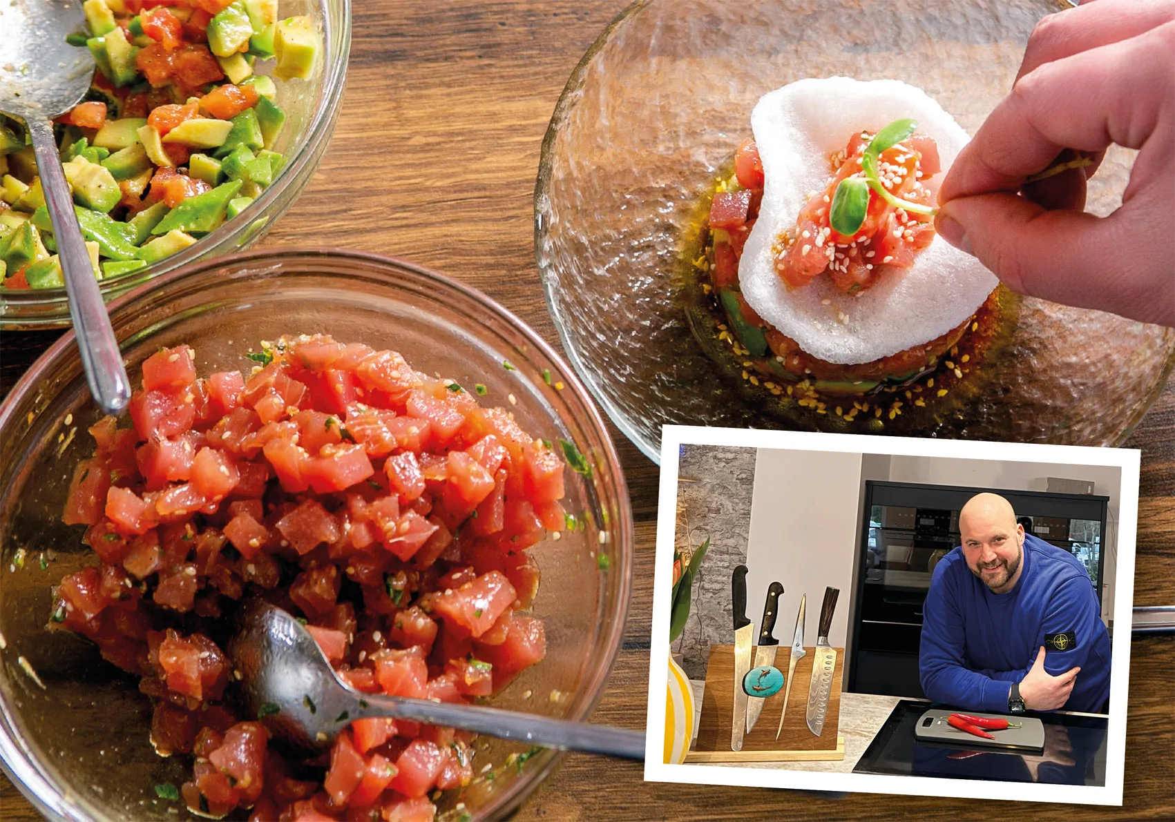 Ende Februar hat er sein Genussatelier in Lilienthal eröffnet. Ein großer Raum mit petrolblauer Küchenzeile, zwei großzügigen Kochinseln und einer langen Tafel, an der später gemeinsam gegessen wird. Gläser stehen bereit, Servietten sind gefaltet, in einer Ecke kühlt bereits der Weißwein. Keine Distanz zwischen Gastgeber und Gästen. „Ich wollte keinen Raum, in dem einer vorne steht und alle nur zuschauen“, sagt er. „Hier arbeiten alle mit.“